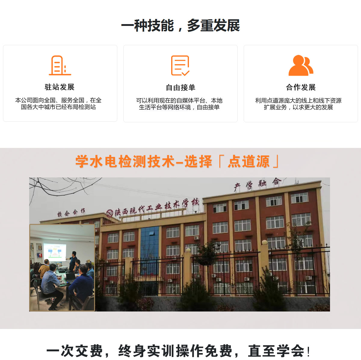 点道源检测技术有限公司,专注于漏水、漏气、漏电业务的研发,在检测技术、设备仪器、检测培训方面积累了大量的经验和研发成果,在外网(市政、消防、热力)检测,和室内检测方面有数百个成功案例,本公司和陕西现代工业技术学校合作打造了具有广泛代表性的种类配套齐全,结构形式复杂多变的实训操作平台,可供学员在有一定理论知识的基础上,模拟各种漏水情况,反复实训操作。